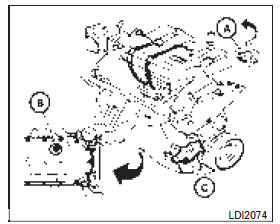 1. Estacione el vehículo en una superficie nivelada y aplique el freno de estacionamiento. 2. Apague el motor. 3. Coloque una charola de gran tamaño debajo del filtro de aceite C.