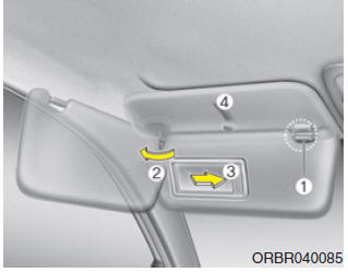 Utilice el parasol para protegerse de la luz directa que entra por las ventanillas delanteras o laterales. Para usar el parasol, tire de él hacia abajo. Para usar un parasol en una ventanilla, tire de él hacia abajo, despréndalo del soporte (1) y gírelo hacia el costado (2). Para utilizar el espejo, tire del visor hacia abajo y deslice la cubierta del espejo (3). La ranura (4) sirve para colocar los tiques de peaje. (opcional)